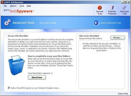 Giant includes a number of "security agents" with their software as well. These include a department-of-defense level "file shredder" as well as functionality to remove your internet "tracks" from your computer (both are located in "advanced tools").